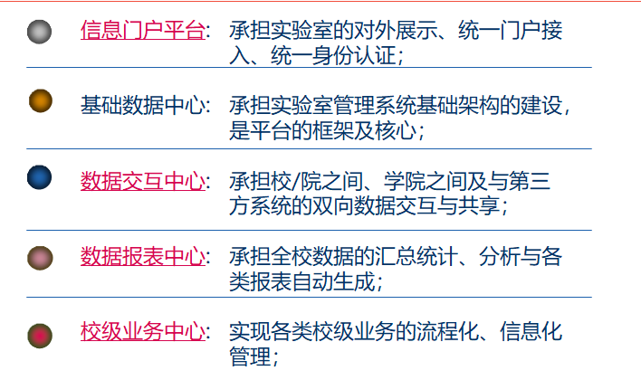 包含服務(wù)平臺基礎(chǔ)架構(gòu):建制實驗室信息、教學(xué)課程信息、儀器設(shè)備信息、人員信息等基礎(chǔ)信息的搭建;發(fā)布實驗室資源現(xiàn)狀、儀器設(shè)備信息、排課信息、教學(xué)課件、教學(xué)成果、規(guī)章制度、收費信息及用戶登錄入口。 |
